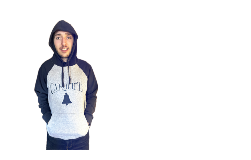 Stylish heather grey hoodie with contrasting black arm trim, inner hood and laces. This good quality AWDis hoodie features the classic Caroline Bell logo from the Radio Caroline Roadshows of the 70s and 80s on the front and listening options on the back.